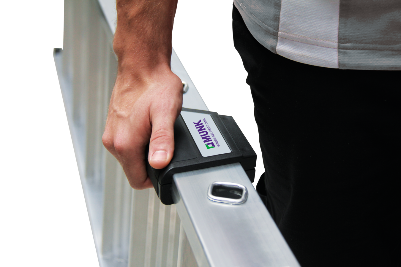 - Stabil verschraubtes, massives Leitergelenk aus Aluminium